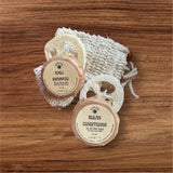 Optional: use the loofah disc to place under the conditioner bar so it can dry between uses and avoid becoming slimy. The sisal bag can be use for when the shampoo bar gets too small to handle.